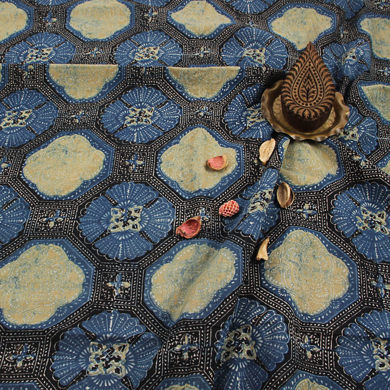 Blue Butta Ajrakh Hand Block Printed Cotton Fabric.