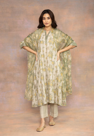 Rozin Green Sanganeri Chanderi Silk A Line Kurta