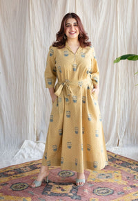Grey Dabu Slub Cotton A Line Dress with Embroidery