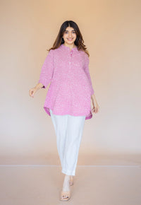 Peach Handblock Printed Slub Cotton A Line Short Top with Hand Embroidery.