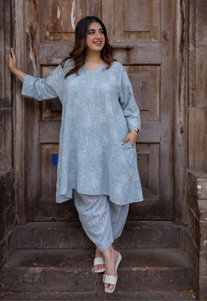 Sky Blue Leaf Hand Block Printed Kota Doria Cotton Dupatta.