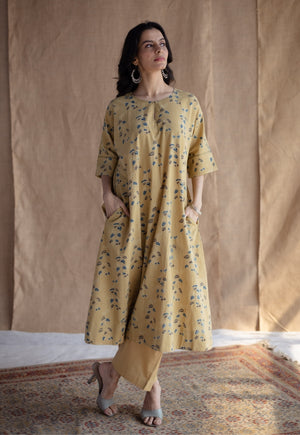 Anu Yellow Ajrakh Cotton A Line Kurta with Hand Embroidery