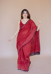 Red Floral Ajrakh Hand Block Print Kota Doria Cotton Saree