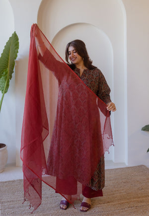 Shinat Red Ajrakh Cotton Kali Kurta with Hand Embroidery
