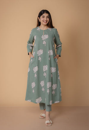 Zoohi Green Dabu Slub Cotton A Line Kurta