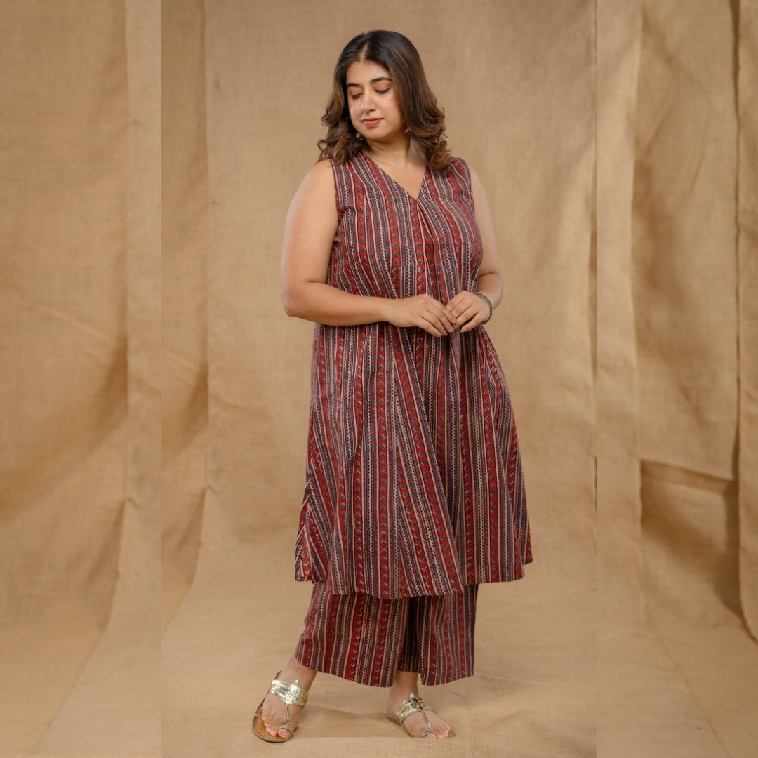 Zehra Madder Ajrakh Chanderi Silk A Line Kurta with Hand Embroidery