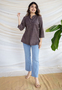 Zinia Beige Hand Block Print Slub Cotton Straight Short Top