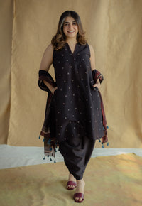 Ayla Black Ajrakh Chanderi Silk A Line Kurta with Hand Embroidery