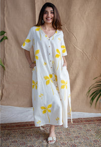 Natural White Dabu Handblock Printed Slub Cotton Kurta with Hand Embroidery Details