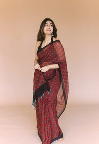 Off White Stripe Ajrakh Hand Block Print Kota Doria Cotton Saree with Unstitched Blouse.