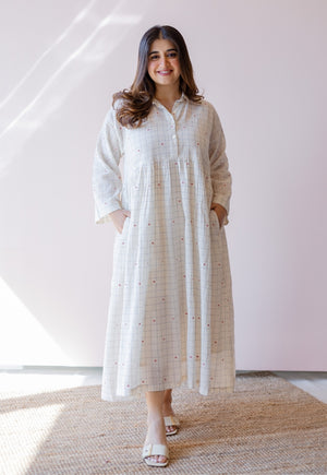 Rhea Off White Jamdani Handloom Cotton A Line Dress