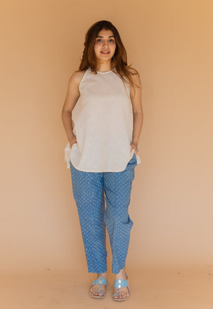 Light Indigo Ajrakh Handblock Printed Cotton Straight Pant.