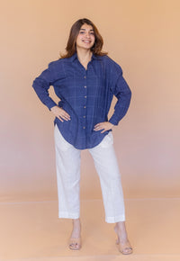 Indigo Dabu Handblock Printed Slub Cotton Straight Short Top.