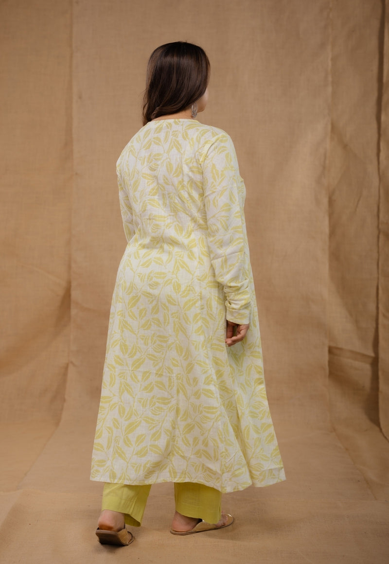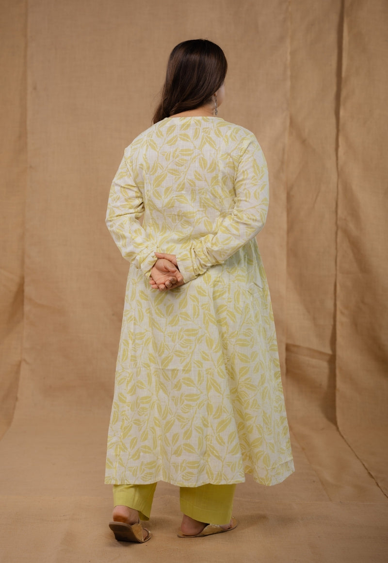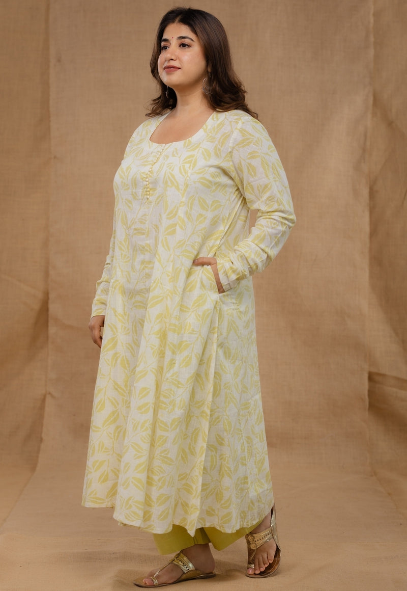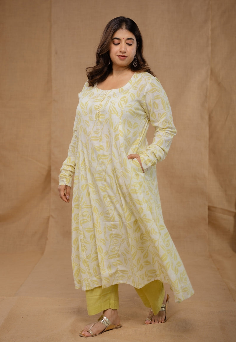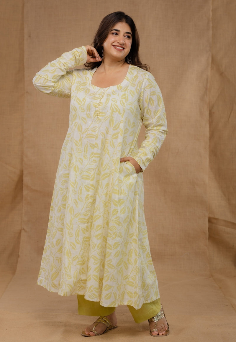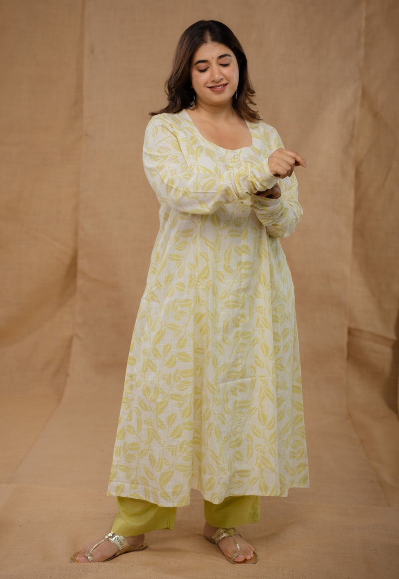 Green Handblock Printed Slub Cotton Kali Kurta.