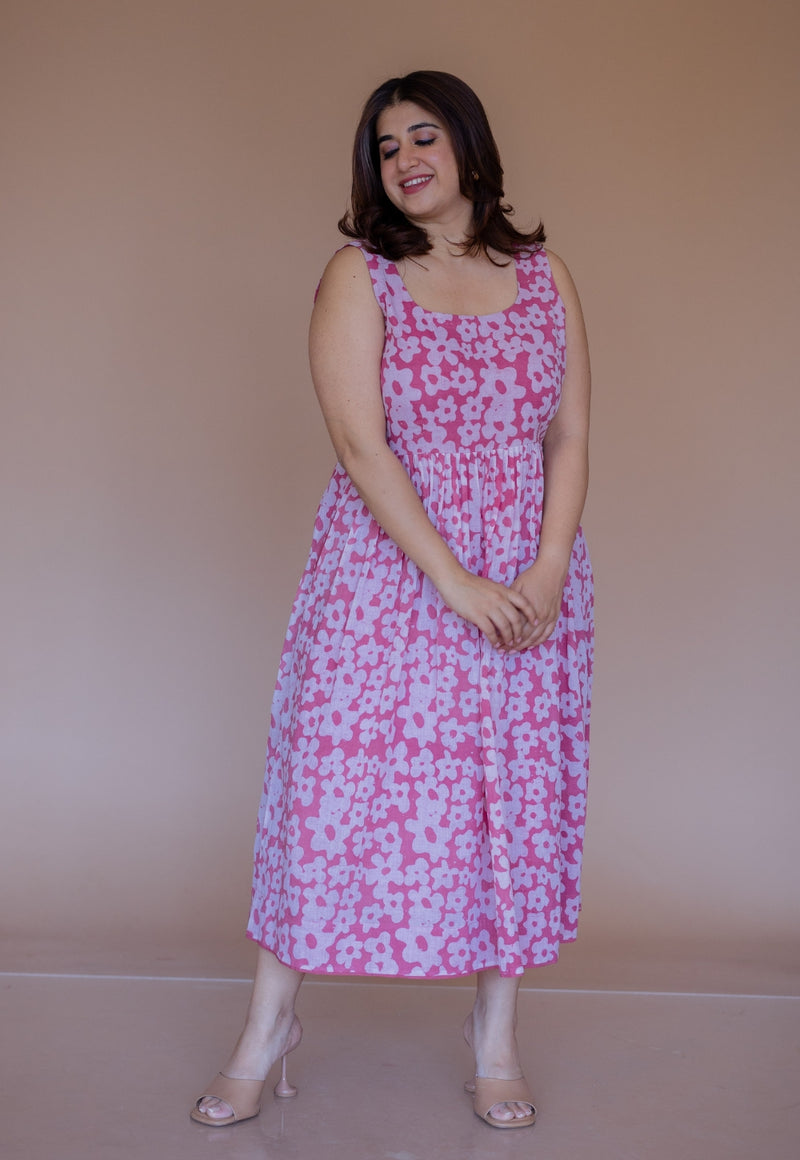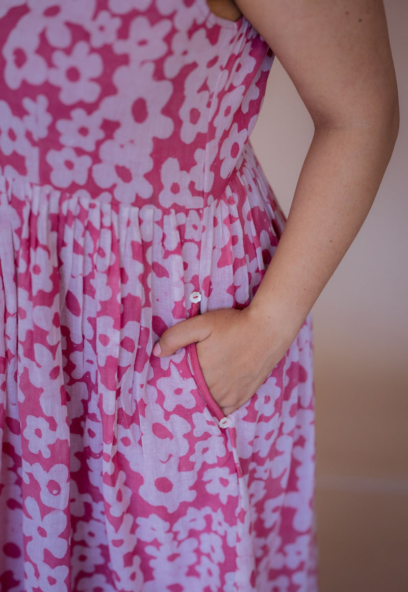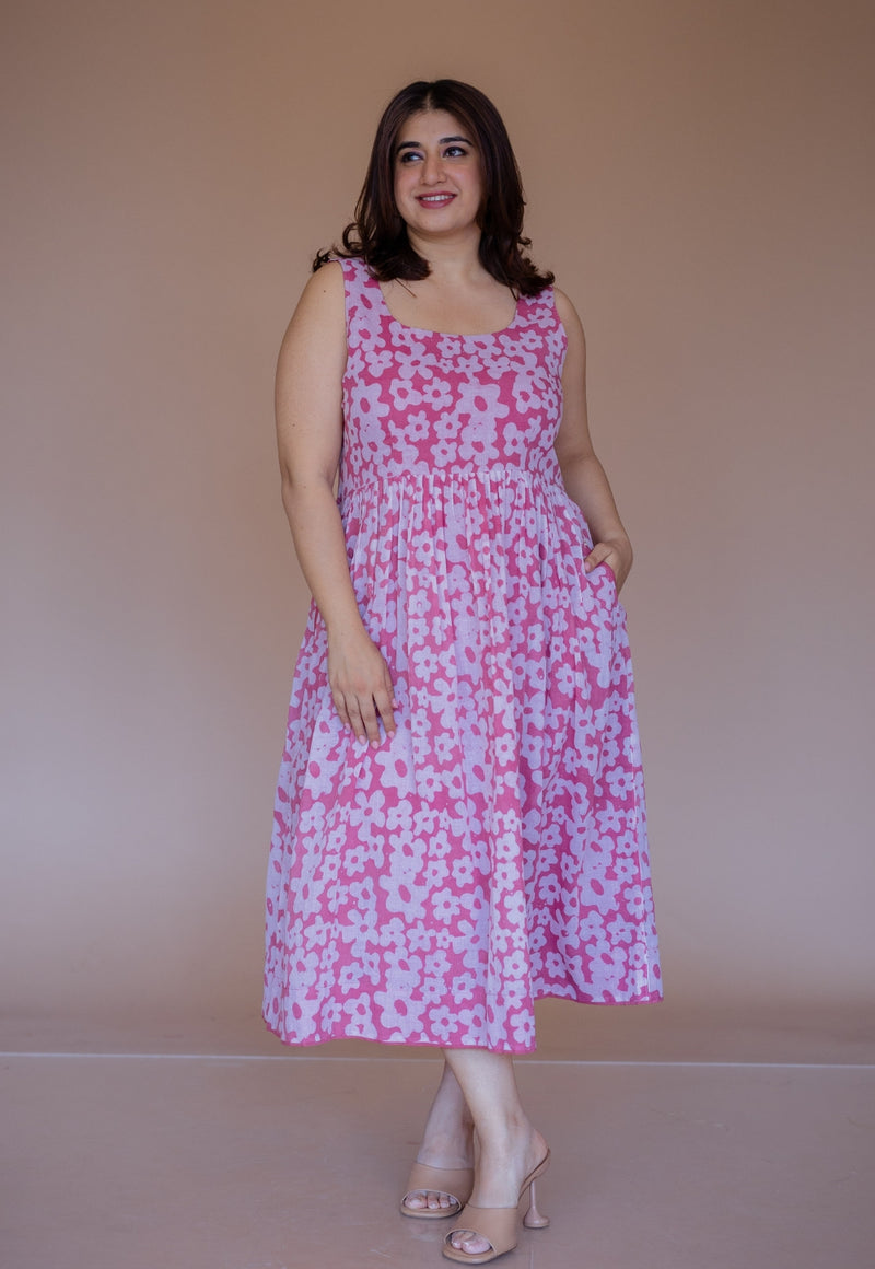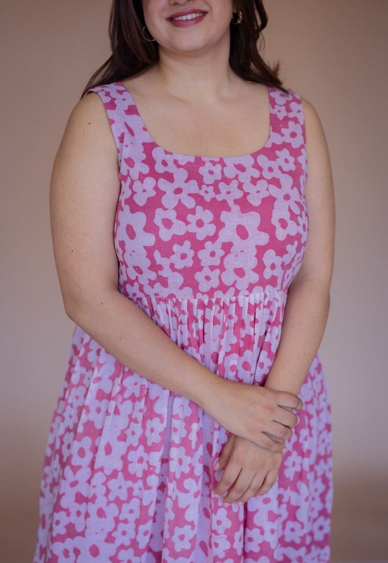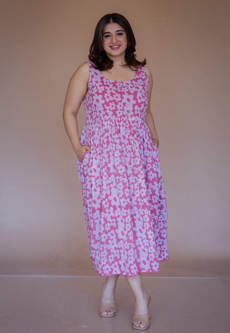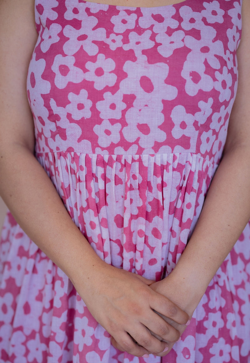 Flamingo Pink Batik Handblock Mul A Line Dress.