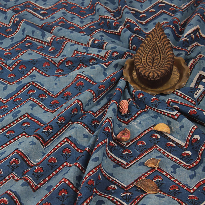 Blue Geometric Jahota Hand Block Print Mul Cotton Fabric