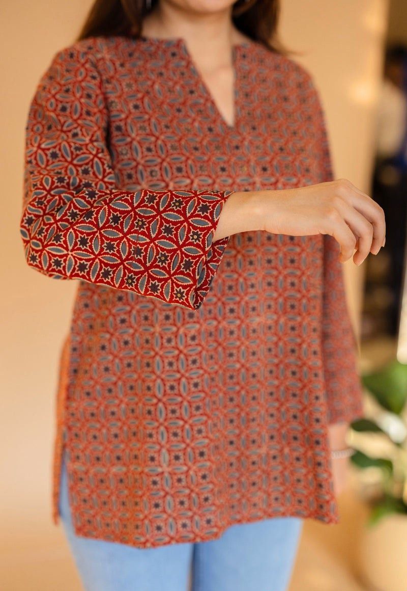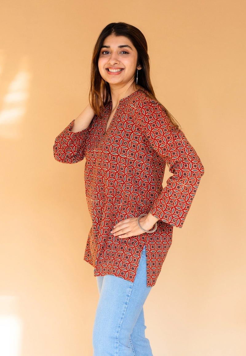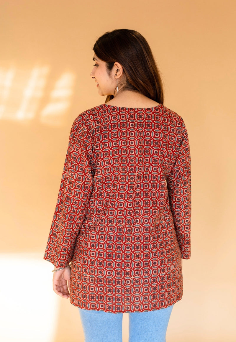 Karvi Red Ajrakh Cotton Straight Short Top with Embroidery