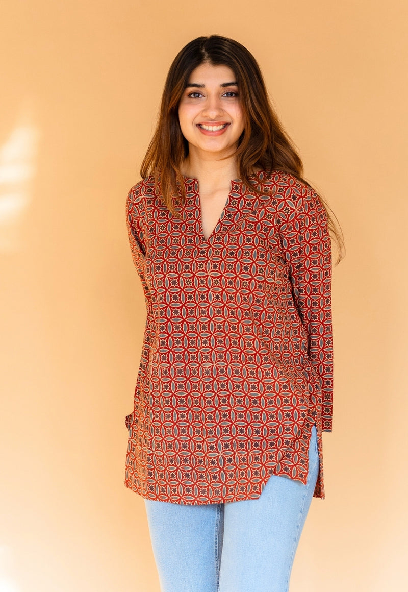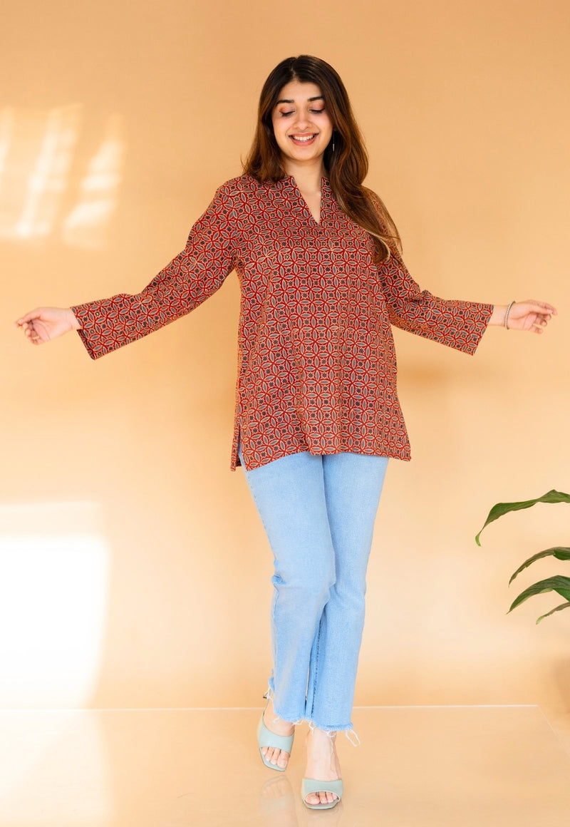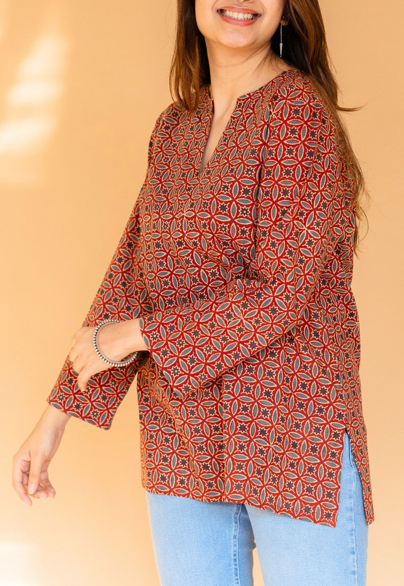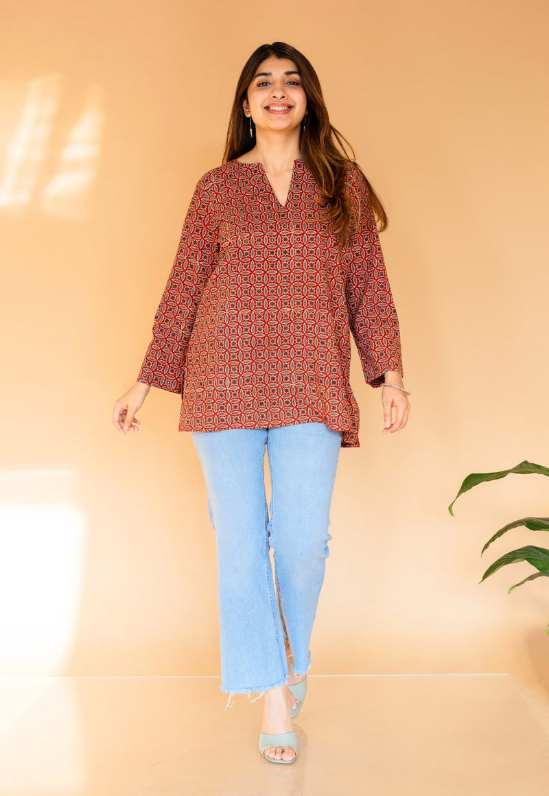 Karvi Red Ajrakh Cotton Straight Short Top with Embroidery