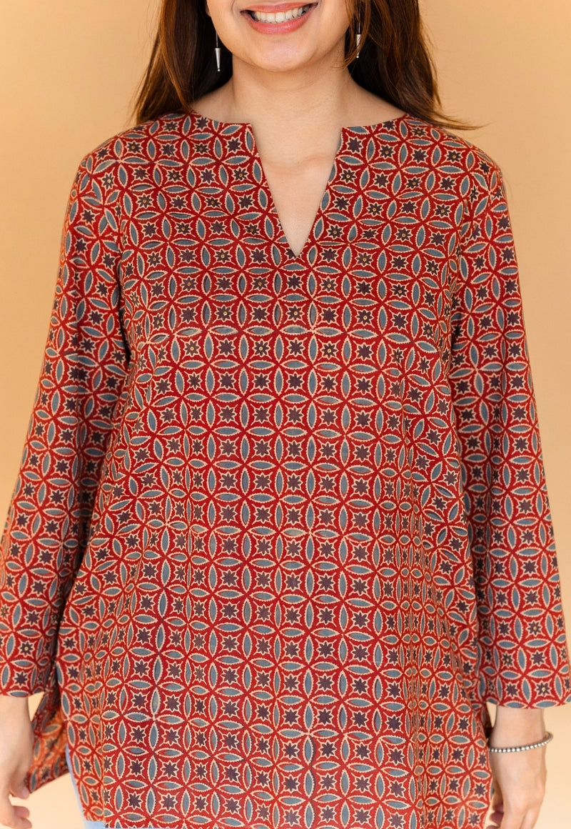 Red Ajrakh Handblock Printed Cotton Straight Short Top with Gold Sequins Work.