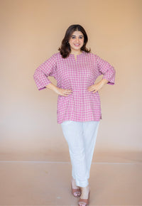 Sky Blue Handblock Printed Slub Cotton Straight Short Top with Hand Embroidery.