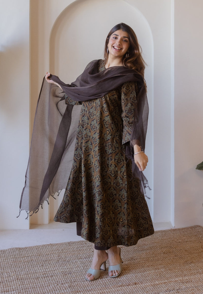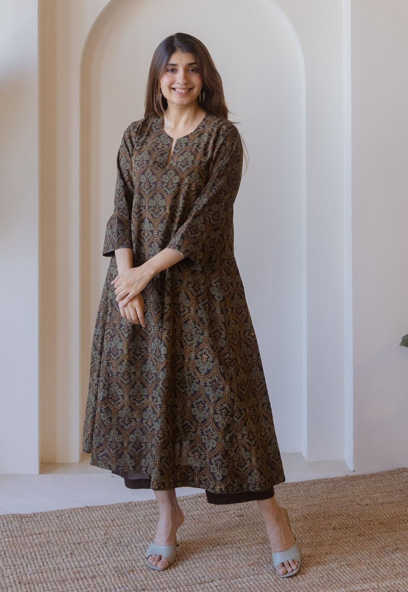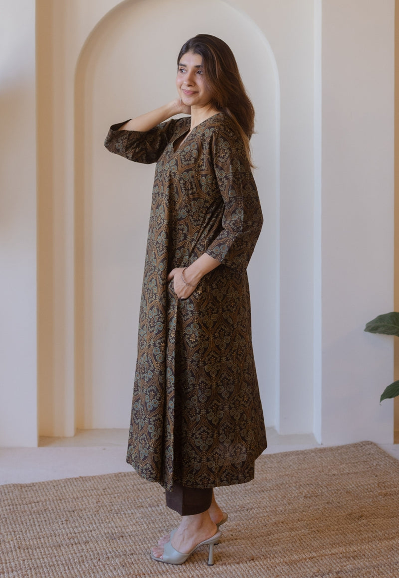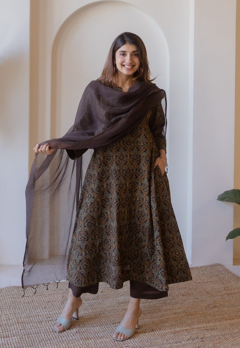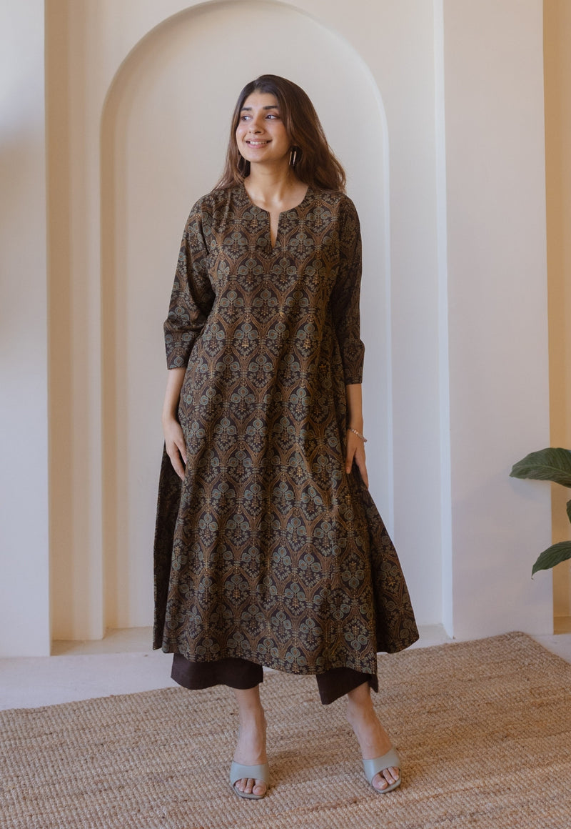 Nyra Brown Ajrakh Cotton Jhabbha Kali Kurta