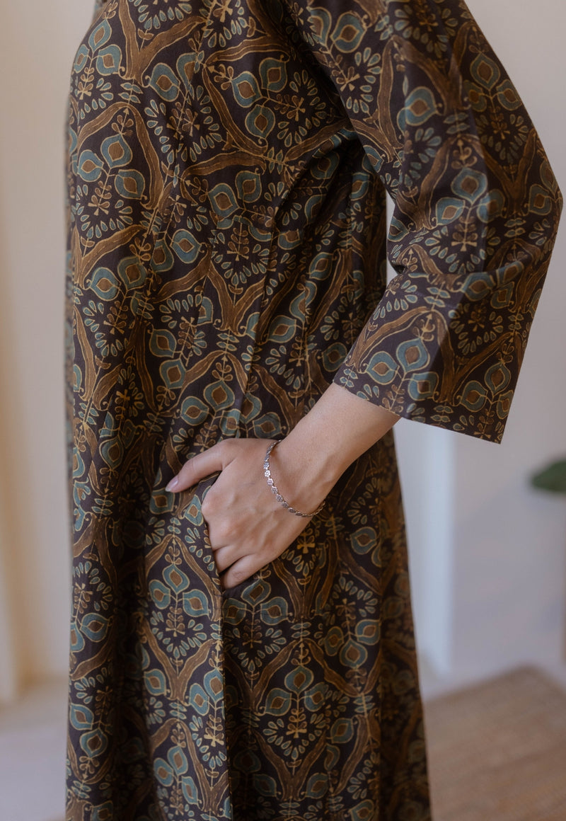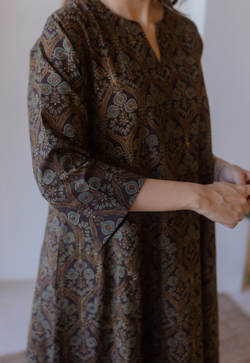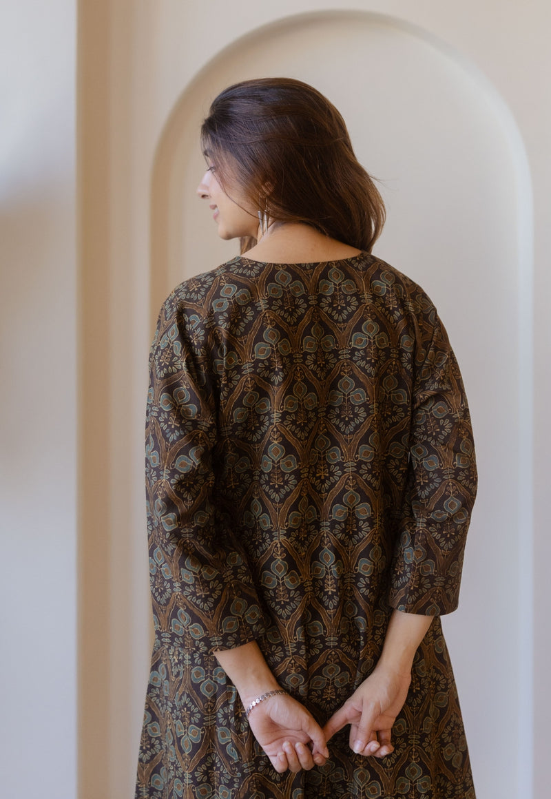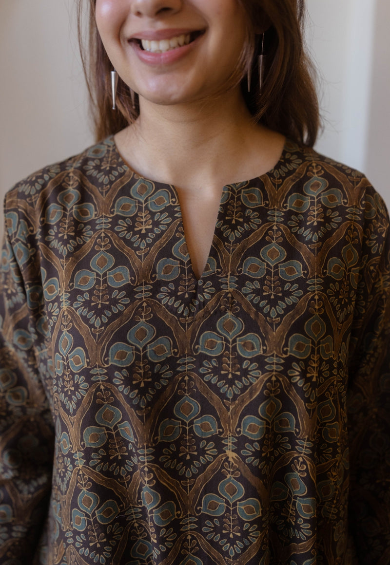 Dark Brown Ajrakh Handblock Printed Cotton Jhabbha Kali Kurta.