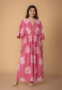 Dark Green Dabu Handblock Printed Slub Cotton Kaftan Dress.