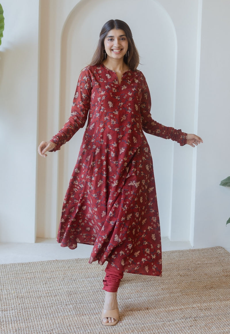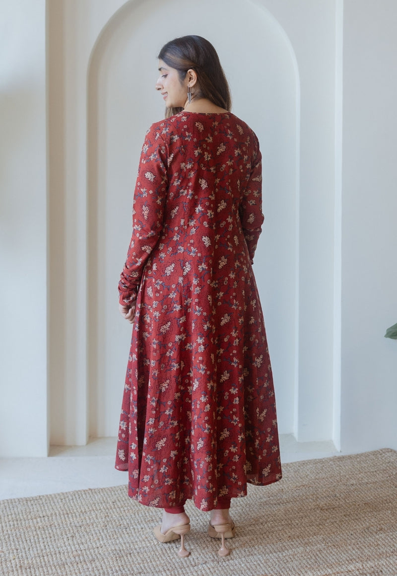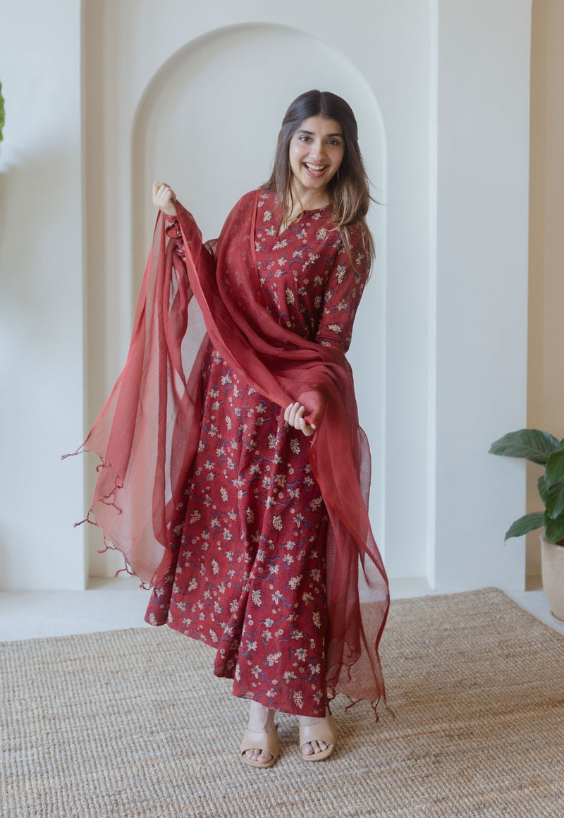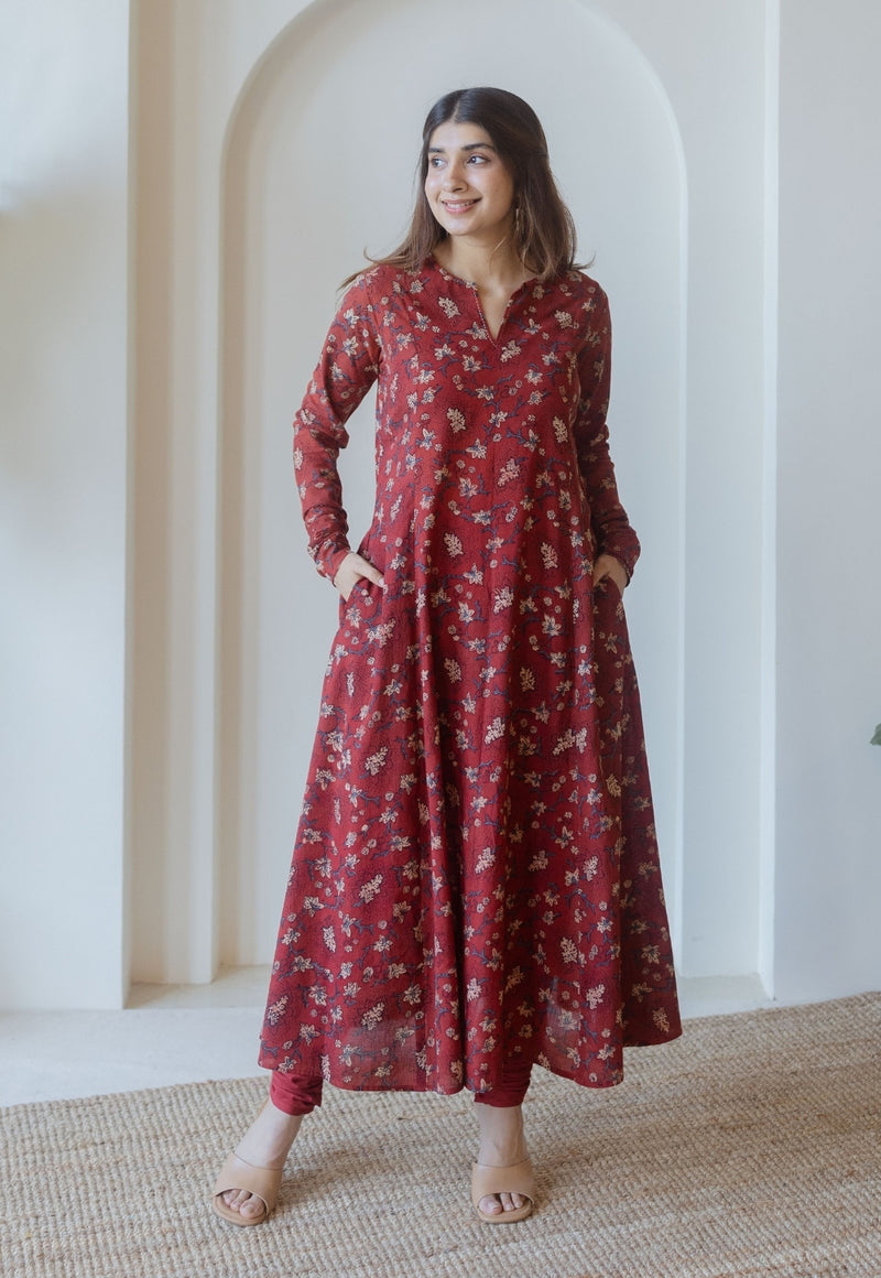 Shinat Red Ajrakh Cotton Kali Kurta with Hand Embroidery