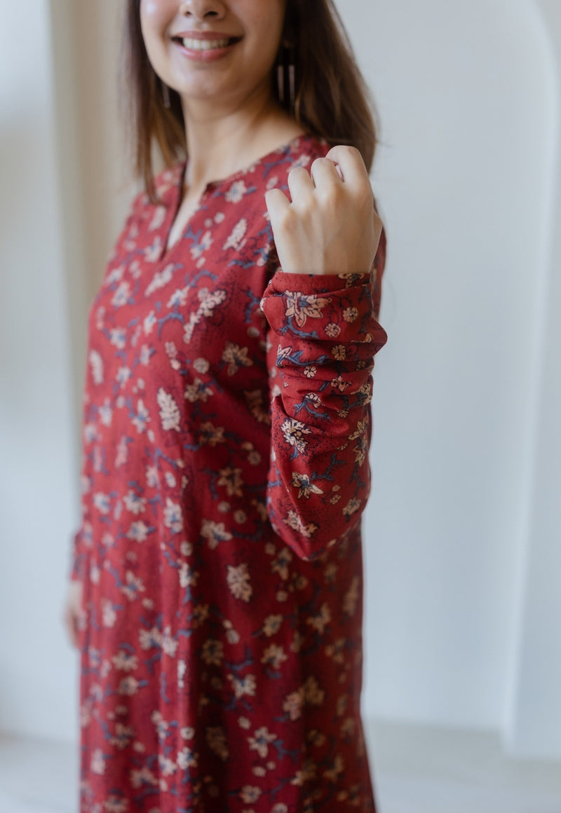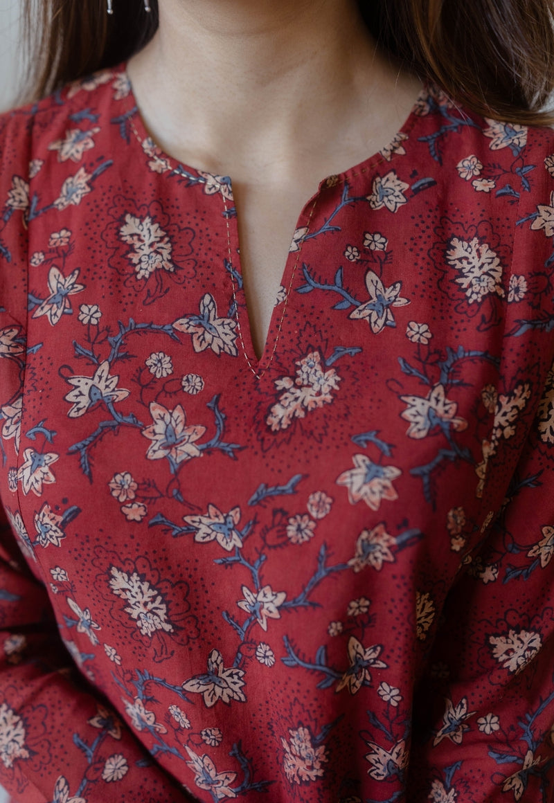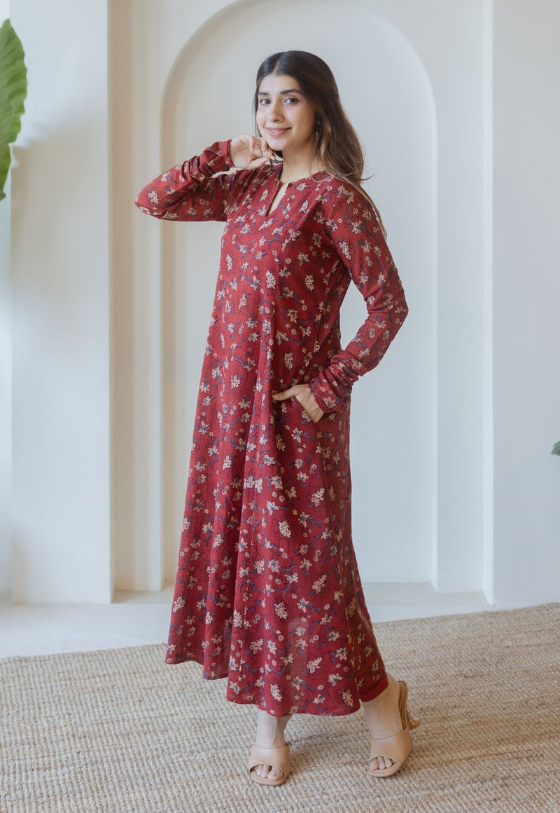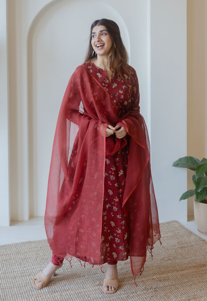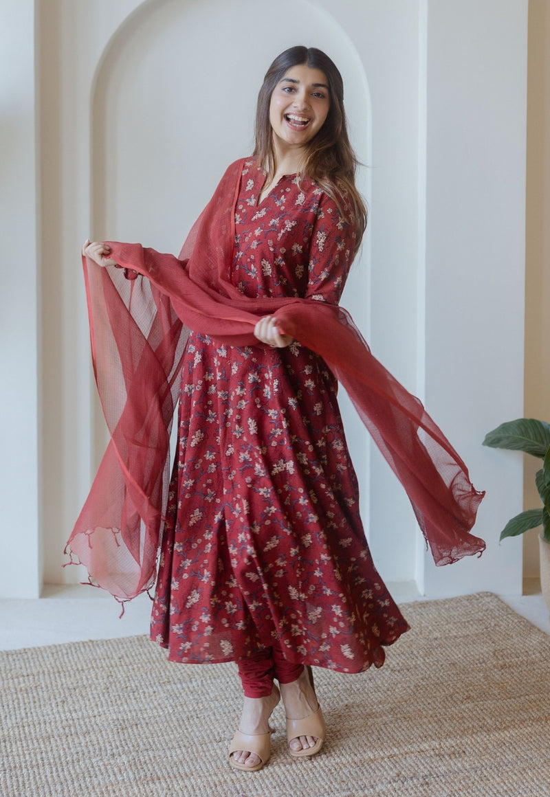 Shinat Red Ajrakh Cotton Kali Kurta with Hand Embroidery