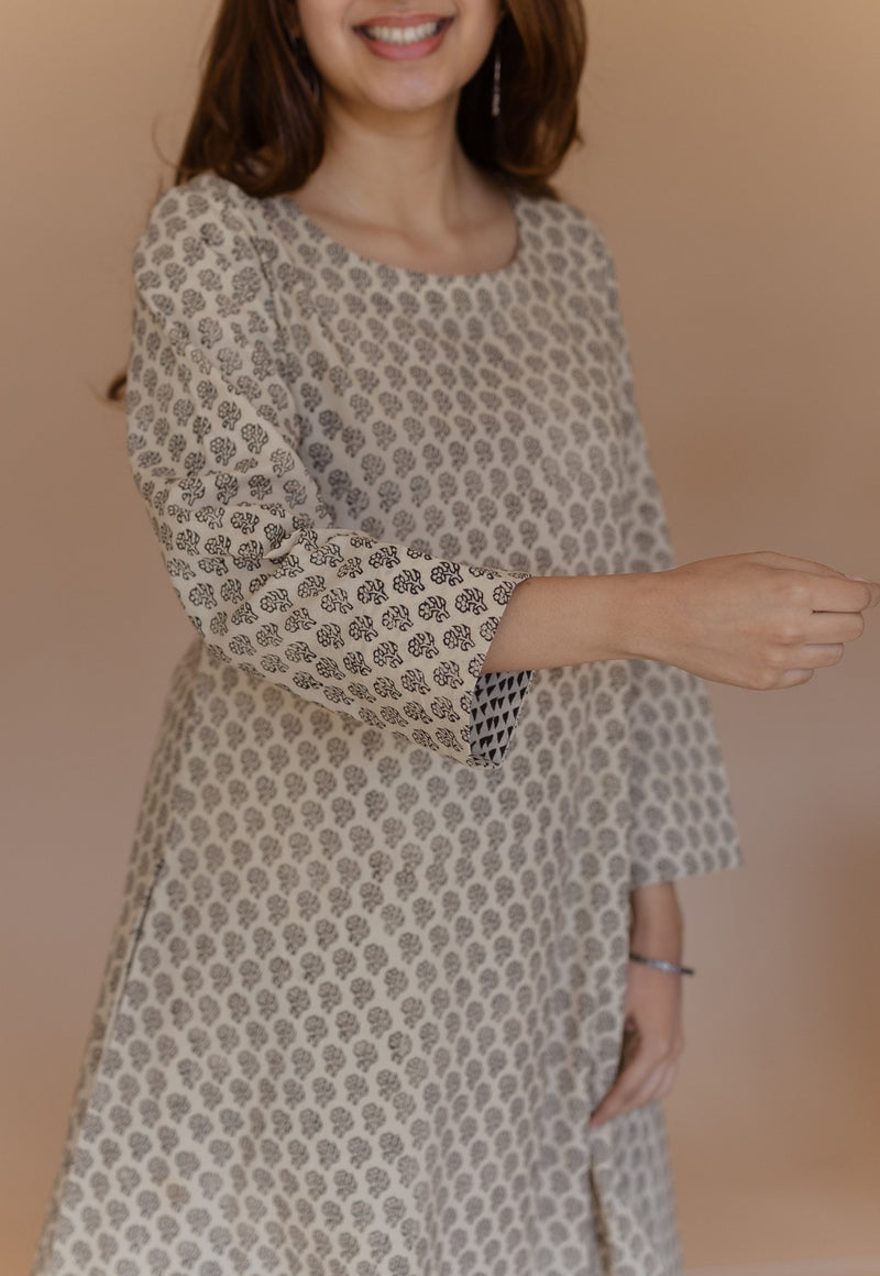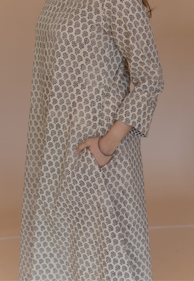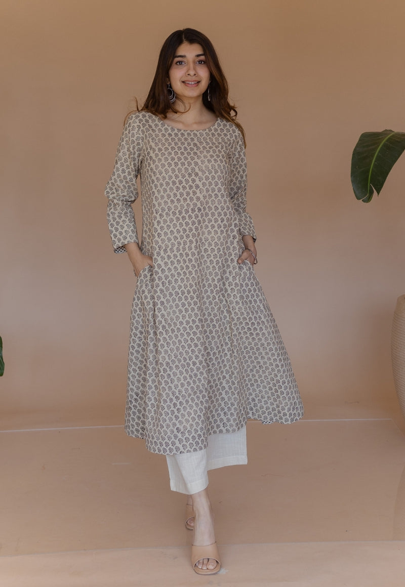 Off White Bagru Handblock Printed Cotton A Line Kurta.