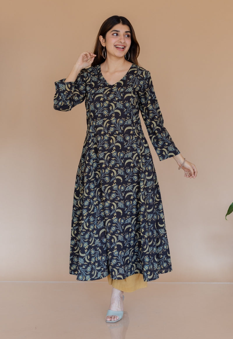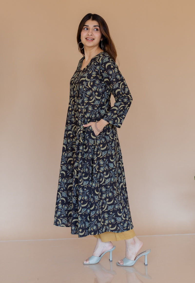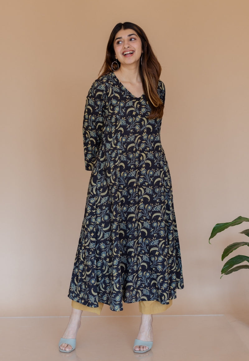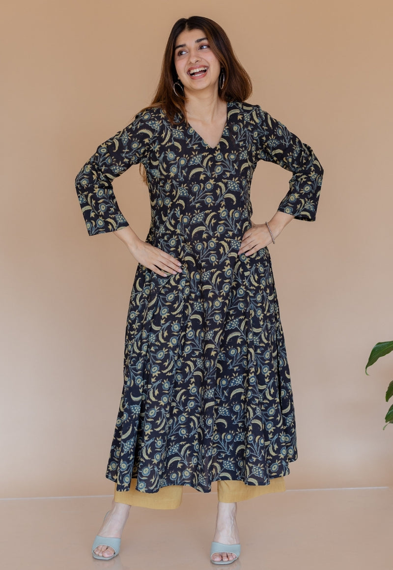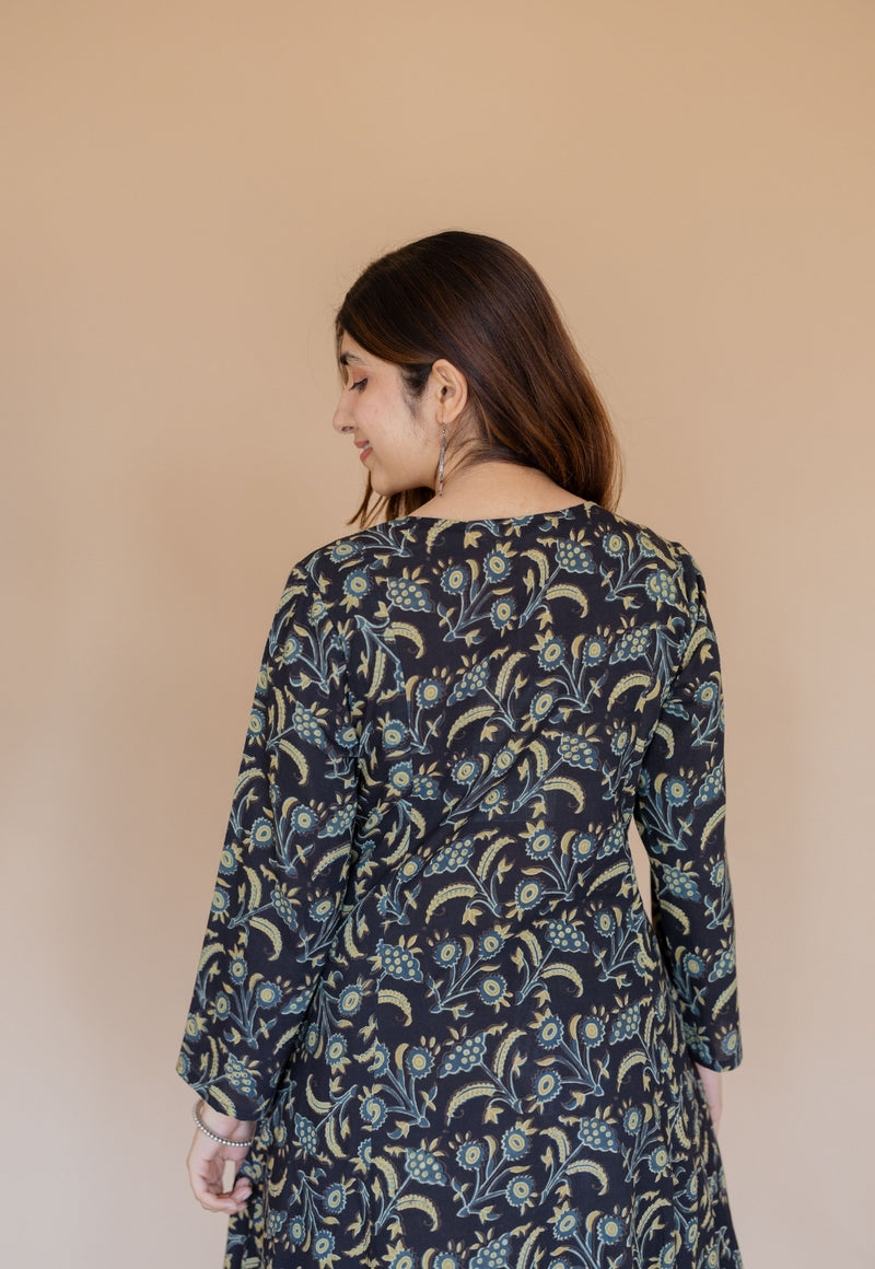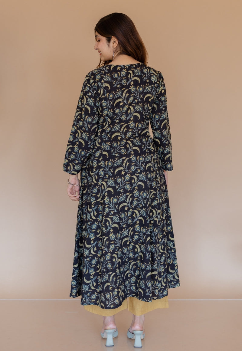 Charcoal Ajrakh Handblock Printed Cotton Kali Kurta.