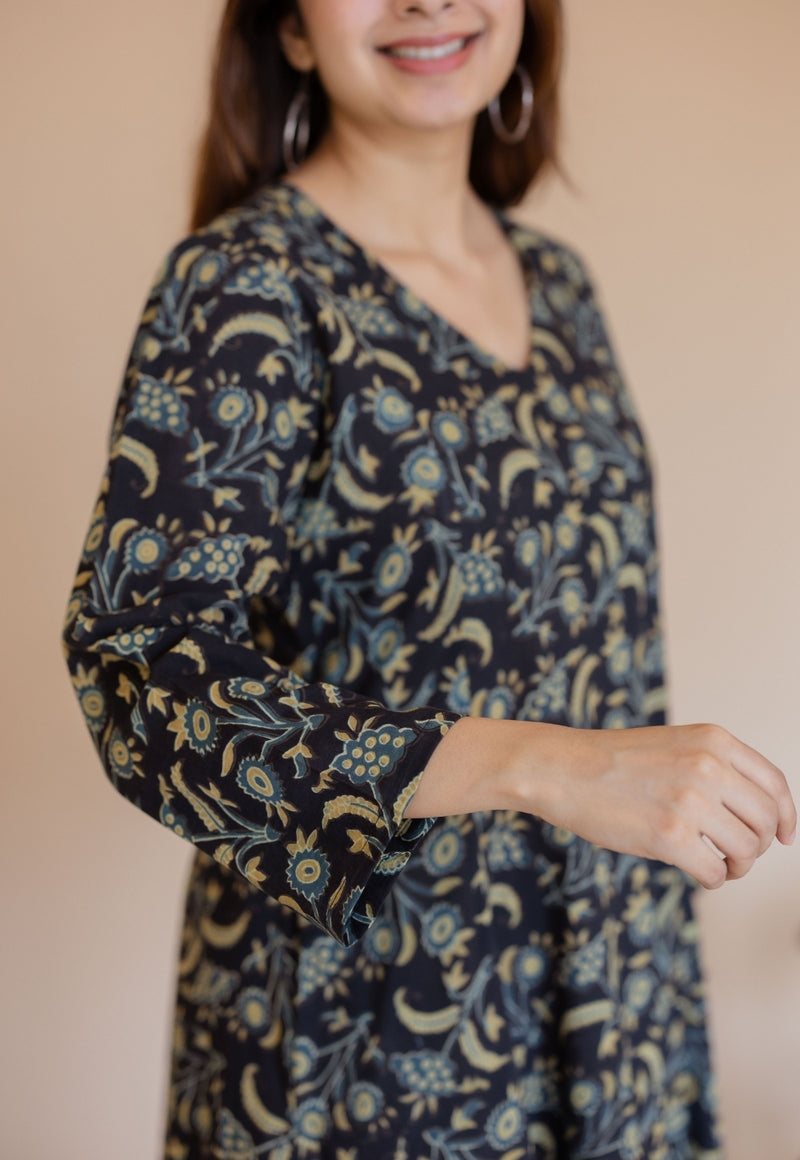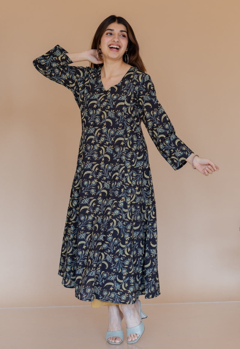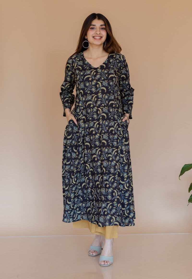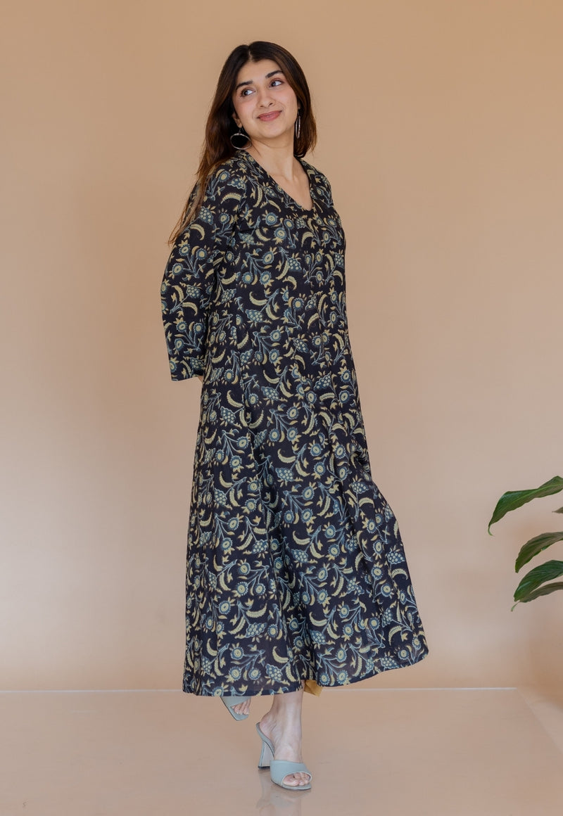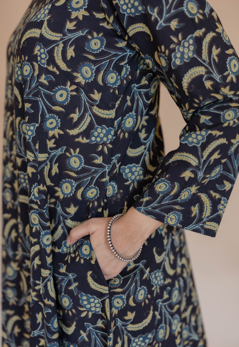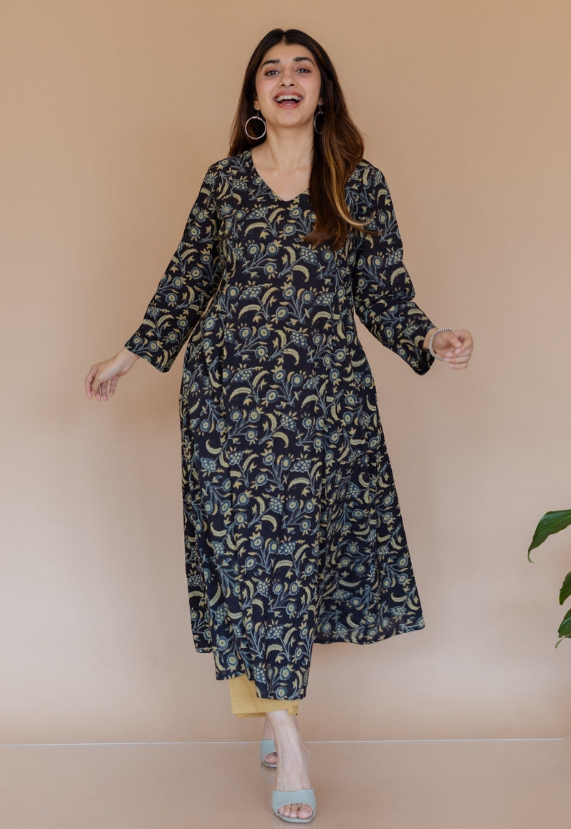 Charcoal Ajrakh Handblock Printed Cotton Kali Kurta.