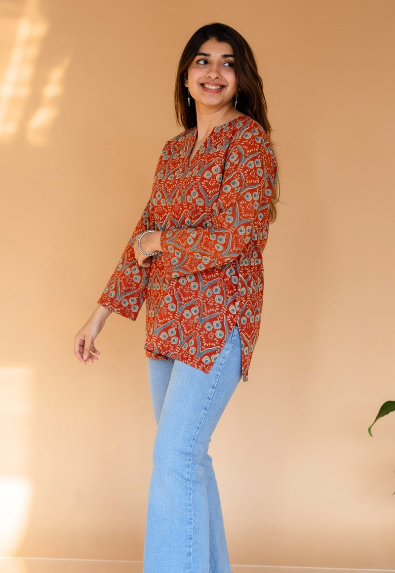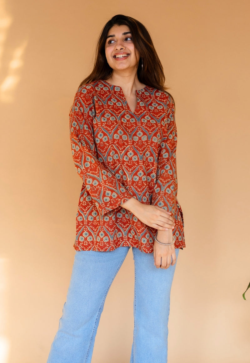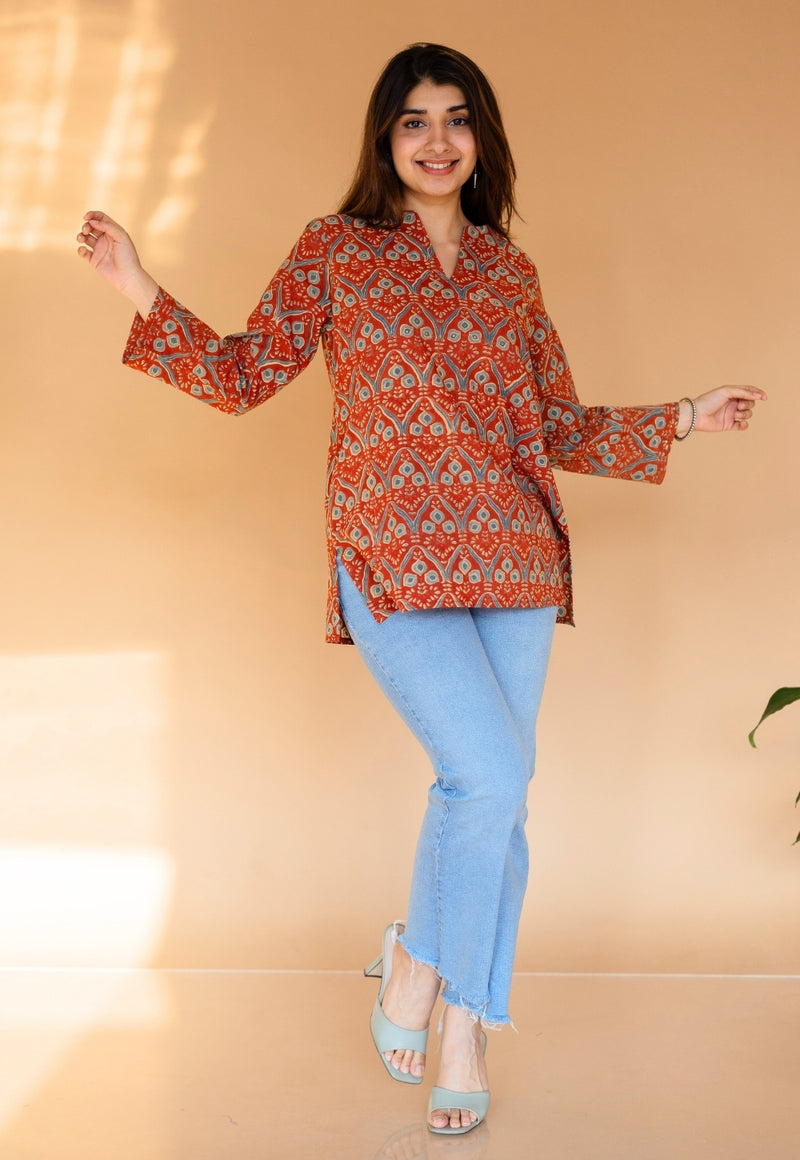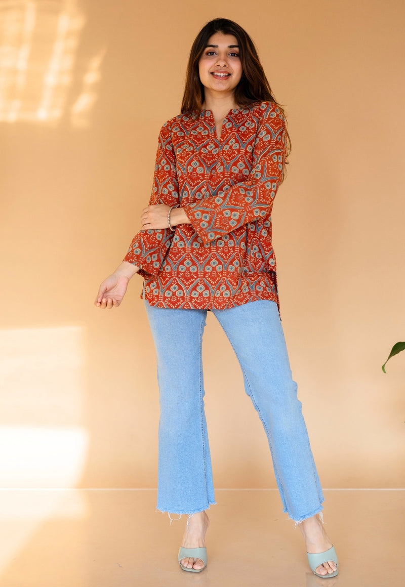 Tapsi Red Ajrakh Cotton A Line Short Top with Hand Embroidery