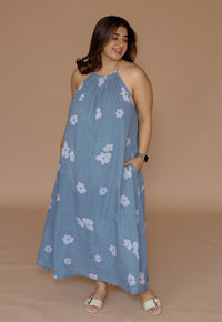 Cadet Blue Batik Handblock Printed Mul Lining A Line Dress with Mul Lining.