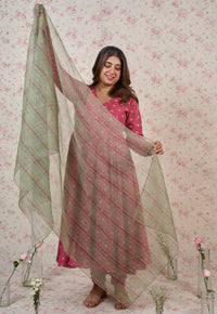 Hot Pink Sanganeri Handblock Printed Kota Doria Cotton Dupatta.