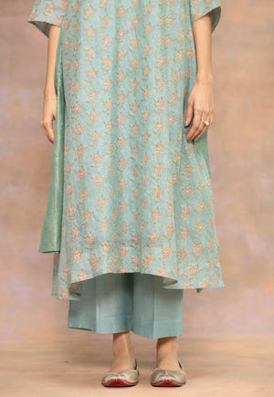 Teal Sanganeri Handblock Printed Chanderi Silk A Line Kurta with Hand Embroidery, Mukaish Detailing and Mul Slip.