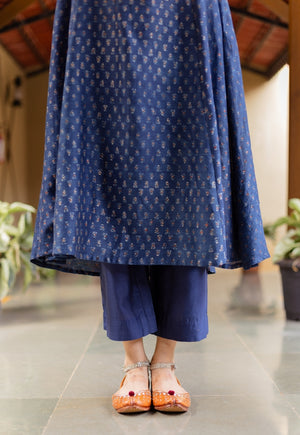 Zafreen Dark Indigo Ajrakh Chanderi Silk A Line Kurta with Hand Embroidery