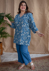 Indigo Ajrakh Handblock Printed Cotton Straight Short Top.