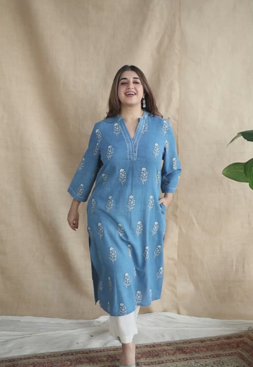 Indigo Dabu Slub Cotton Straight Kurta with Embroidery