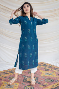 Green Dabu Straight Slub Cotton Kurta with Hand Block Printing.