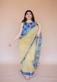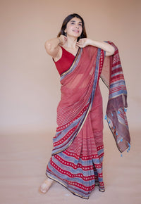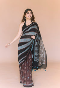 Blue Car Ajrakh Hand Block Print Chanderi Saree with Unstitched Blouse.