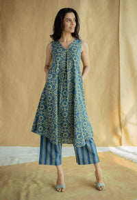 Indigo Kalamkari Handblock Printed Cotton Kali Kurta.