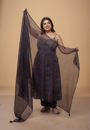 Charchoal Kalamkari Handblock Printed Cotton A Line Kurta.