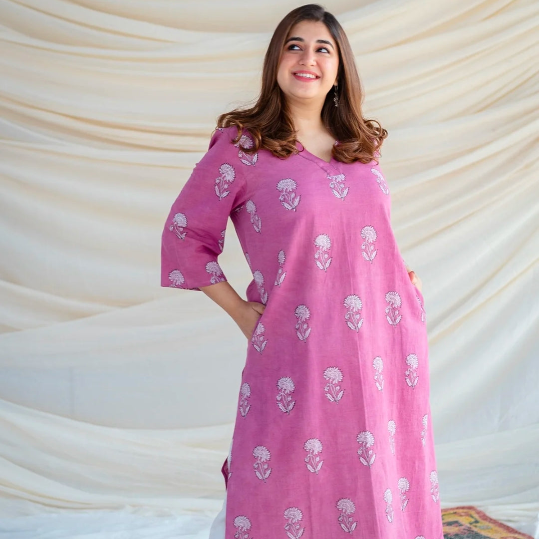 Eshika Pink Dabu Slub Cotton A Line KurtaEshika Pink Dabu Slub Cotton A Line Kurta