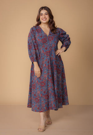 Yellow Sanganeri Handblock Printed Mul Cotton A Line Dress.