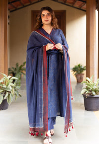 Madder Ajrakh Handblock Printed Chanderi Silk A Line Kurta with Hand Embroidery.