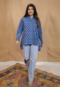 Beige Handblock Printed Slub Cotton A Line Short Top.