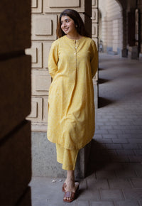 Cream Handblock Printed Slub Cotton A Line Kurta.