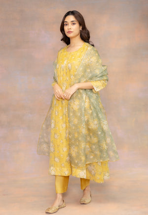 Rozin Green Sanganeri Chanderi Silk A Line Kurta