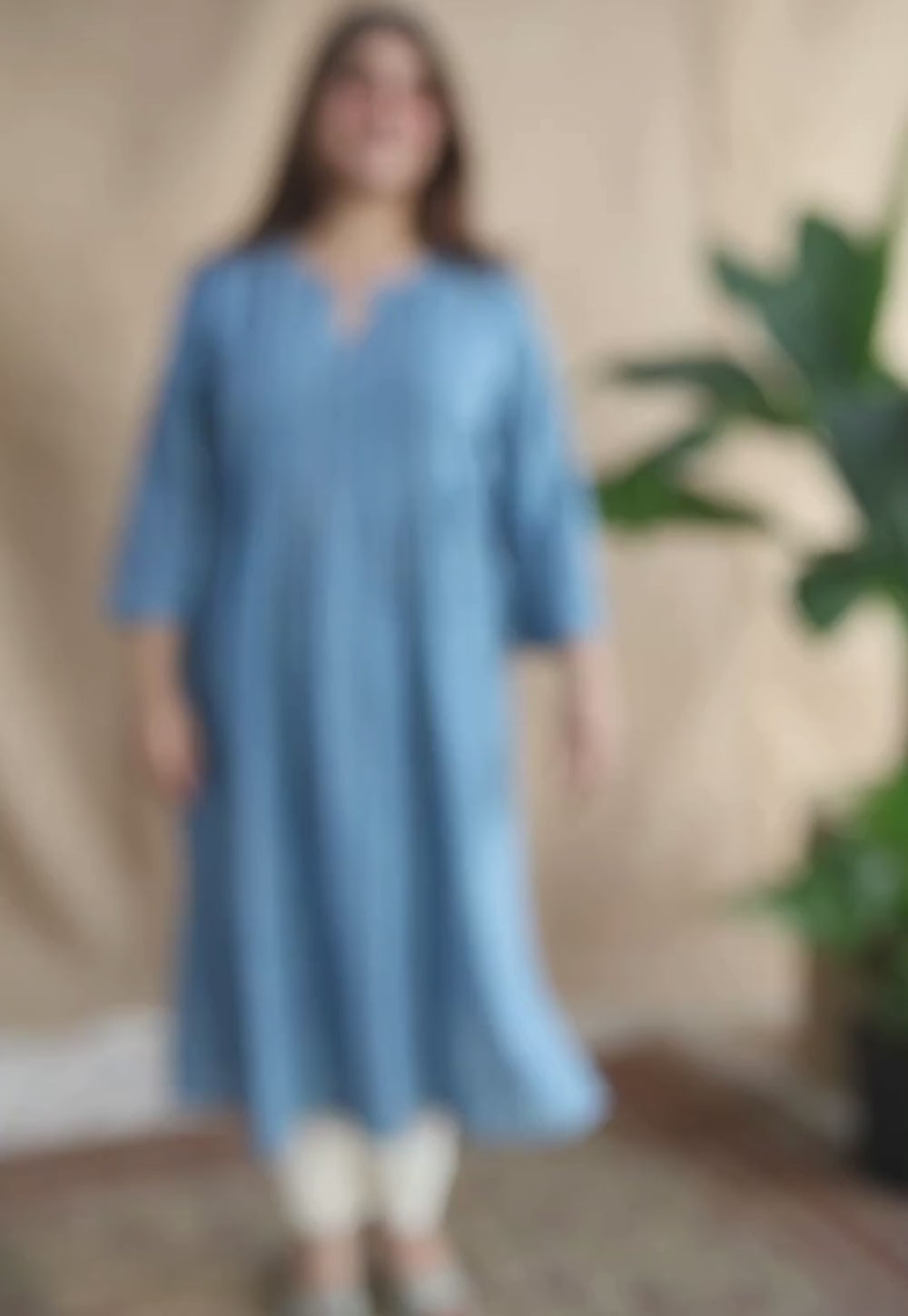 Blue Dabu Handblock Printed Slub Cotton Kurta with Hand Embroidery Details.